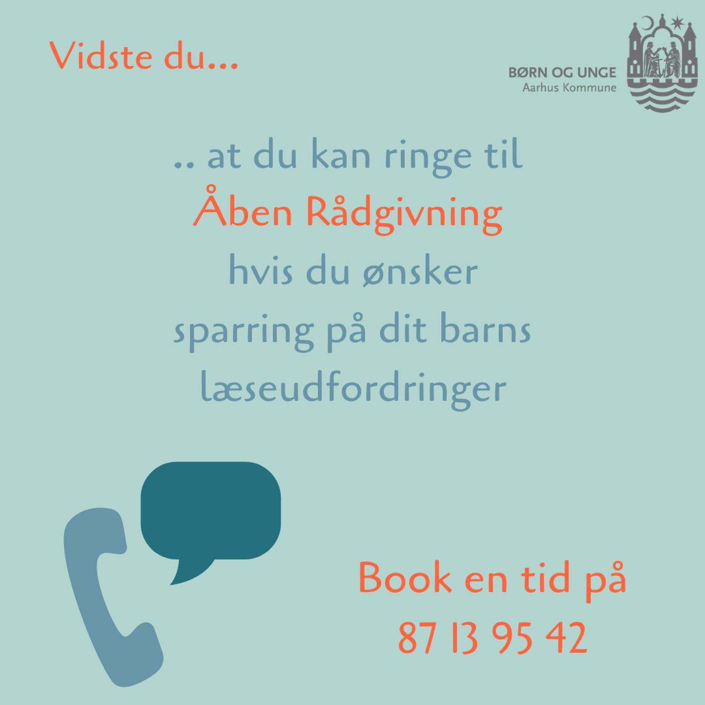 Du er velkommen til at henvende dig til KCL - Kompetencecenter for Læsning på 87139542 for at lave en aftale om telefonisk rådgivning med en læsekonsulent.